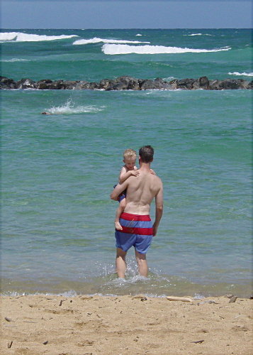 Andy taking a dip in the ocean with Daddy. His sister didn't