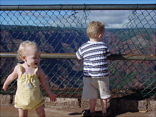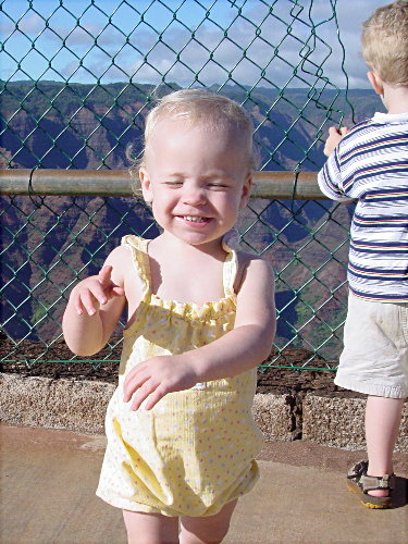 Andy enjoying a clear view of the canyon while Amelia runs around like